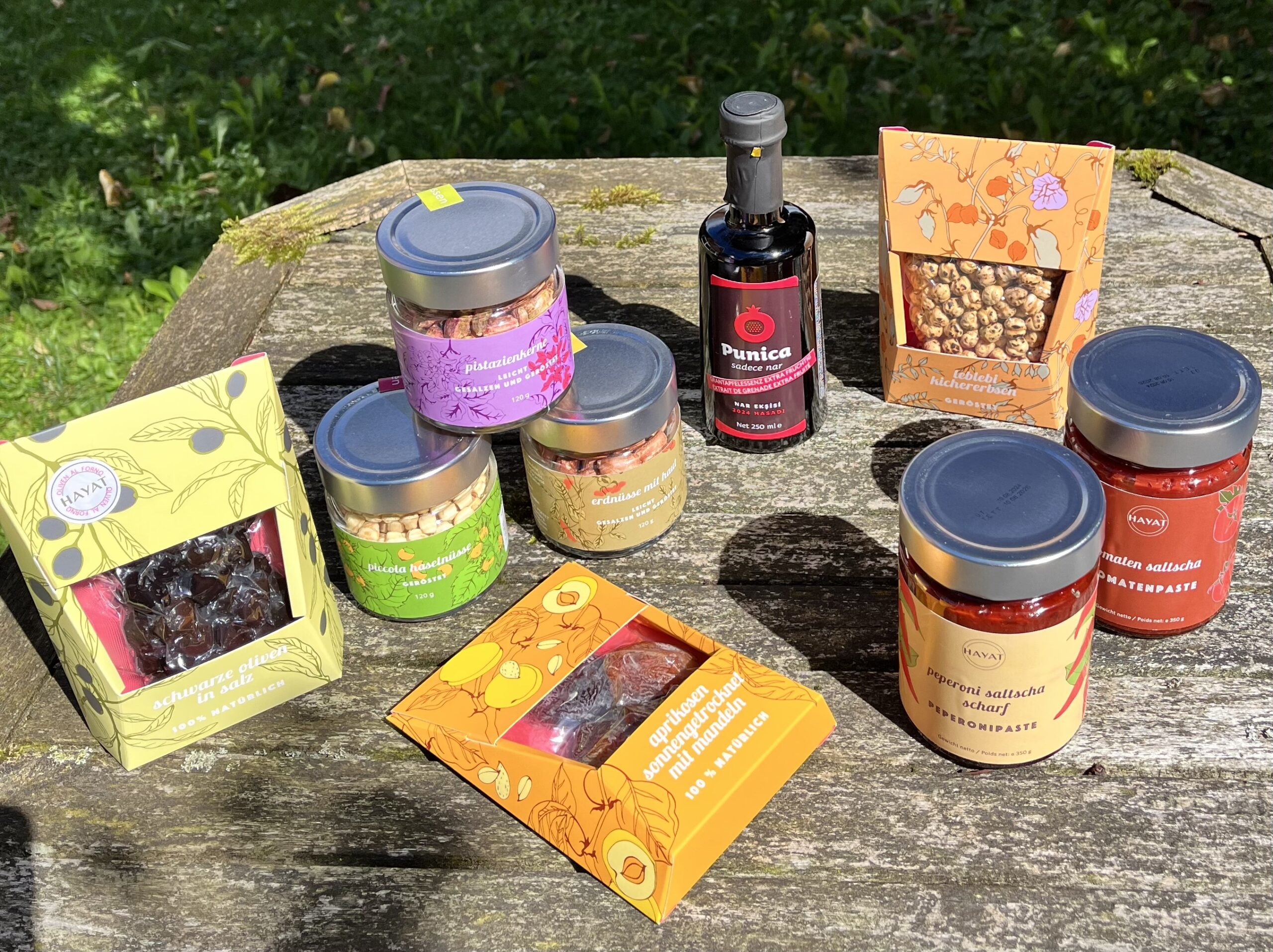 Wir vakuumieren die HAYAT Produkte in Gläsern oder in wiederverschliessbaren Beuteln. Die Beutel verpacken wir in edlen, farbig illustrierten Stehkartons oder versehen sie mit Kartonreitern in den selben Farben. Dank der Vakuumierung bleiben sie lange frisch und behalten ihr unvergleichliches Aroma.